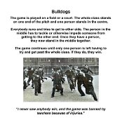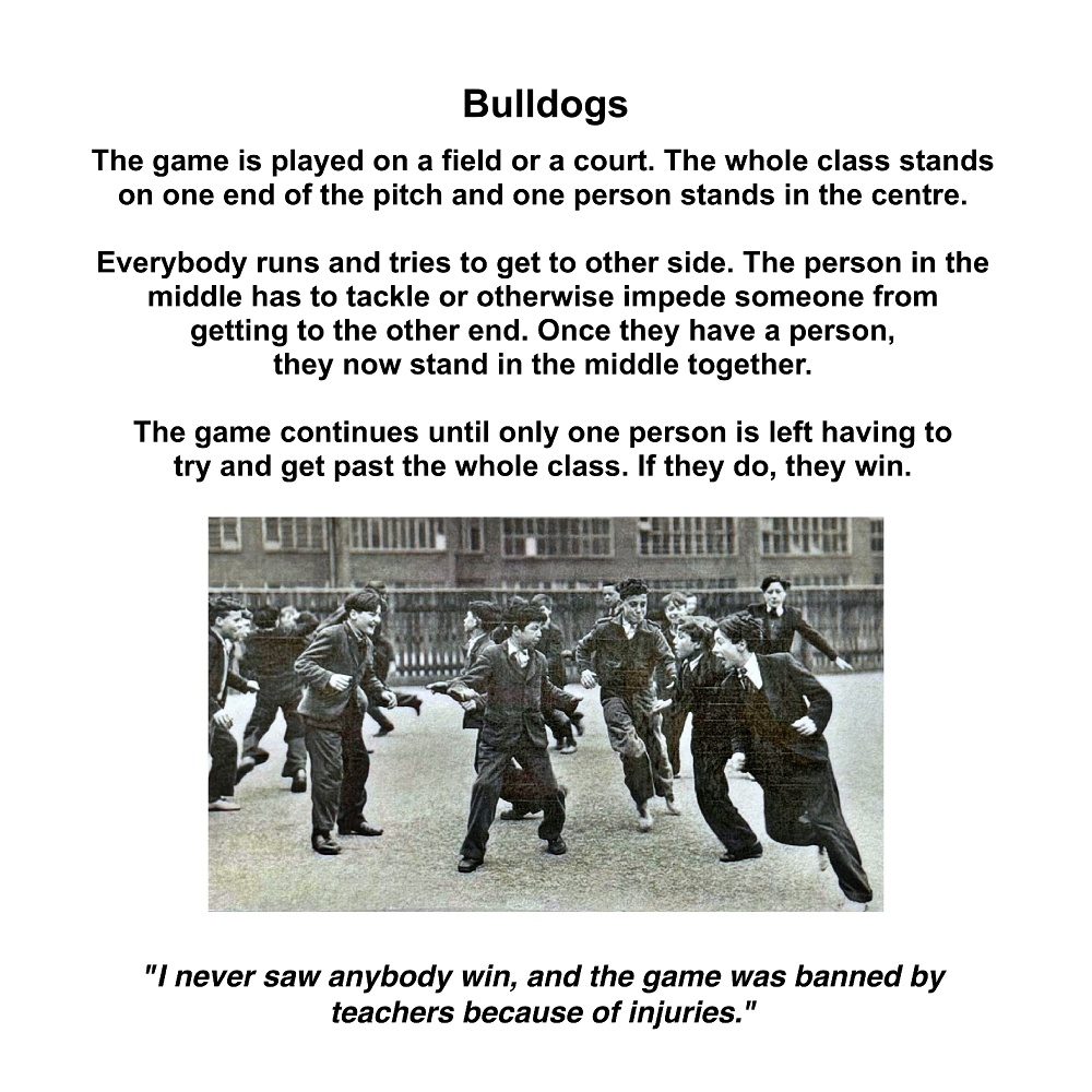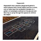 Ball Games Hopscotch Marbles French Cricket Hide and Seek Skipping Elastics Knuckles/Jacks Pussy in the Corner Slingshot Vigoro Tug of War Maypole Dancing Egg and Spoon Race Sack Race Three-legged Race Tops Fly Bulldogs Yo-Yos Keywords New images Miscellaneous Memories